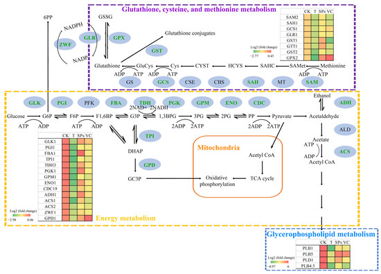 Heatmaps of DEGs encoding key enzymes in energy metabolism; glutathione, cysteine, and methionine metabolism; and glycerophospholipid metabolism. Gene name marked in green over the purple dot indicates that the gene was significantly downregulated in the theasaponins–VC combination group compared with the control group. Short names and corresponding full names are listed as follows. CK—the control group; SPs—the theasaponins group; VC—the ascorbic acid group; T—the combination group; G6P—glucose-6-phosphate; F6P—fructose-6-phosphate; F1,6BP—fructose-1,6-bisphosphate; G3P—glyceraldehyde-3-phosphate; 1,3BPG—1,3-bisphosphoglycerate; 3PG—3-phosphoglycerate; 2PG—2-phosphoglycerate; PP—phosphoenolpyruvate; DHAP—dihydroxyacetone phosphate; GC3P—glycerol-3-phosphate; Acetyl CoA—acetyl-coenzyme A; TCA cycle—tricarboxylic acid cycle; SAMet—S-adenosyl-methionine; SAHC—S-adenosyl-homocysteine; HCYS—homocysteine; CYST—cystathionine; Cys—cysteine; GluCys—γ-glutamylcysteine; GSSG—glutathione disulfide; ATP—adenosine triphosphate; ADP—adenosine diphosphate; NAD+—nicotinamide adenine dinucleotide; NADH—reduced nicotinamide adenine dinucleotide; NADPH—reduced nicotinamide adenine dinucleotide phosphate; NADP—nicotinamide adenine dinucleotide phosphate; 6PP—6-phosphogluconolacone; GLK—glucokinase; PGI—glucose-6-phosphate isomerase; PFK—phosphofructokinase; FBA—fructose-bisphosphate aldolase; TDH—glyceraldehyde-3-phosphate dehydrogenase; PGK—phosphoglycerate kinase; GPM—phosphoglycerate mutase; ENO—enolase; CDC—pyruvate kinase; TPI—triosephosphate isomerase; GPD—glycerol-3-phosphate dehydrogenase [NAD(+)]; ADH—alcohol dehydrogenase; ALD—acetaldehyde dehydrogenase; ACS—acetyl-coenzyme A synthetase; SAM—S-adenosylmethionine synthase; MT—methyltransferase; SAH—S-adenosylhomocysteinase; CBS—cystathionine β-synthase; CSE—cystathionine γ-lyase; GCS—γ-glutamylcysteine synthetase; GS—glutathione synthase; GST—glutathione S-transferase; GPX—glutathione peroxidase; GLR—glutathione reductase; ZWF—glucose-6-phosphate 1-dehydrogenase; PLB—phospholipase B; PLD—phospholipase D.