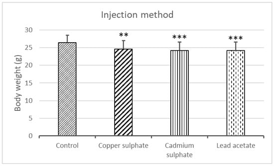 The body weights of the chicken embryos were significantly reduced due to the injection of copper sulfate and cadmium sulfate into the eggs []; this was also found in our study due to the treatment of Cd, Cu, and Pb by both application techniques. However, compared with the control groups, the reduction of body weight caused by all metals was higher due to the injection application (Cu: 6.90%, Cd: 8.60%, Pb: 9.10%) than in the case of the immersion treatment (Cu: 3.60%, Cd: 6.70%, Pb: 6.90%).