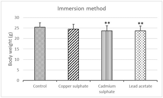 Evolution of the embryonic body weight due to immersion treatment. [** Significant difference from the control (Cd: p = 0.0025; Pb: p = 0.0013)].