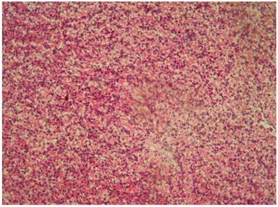 Elemental copper is not toxic; of copper salts, 400–900 mg/kg of copper sulfate is the single toxic dose for poultry. Copper salts are only slowly and partially absorbed from the stomach and intestines []. After absorption, copper binds to albumin and amino acids in the blood. The circulating copper ions form hemocuprein and ceruloplasmin with blood proteins, erythrocuprein in red blood cells, and are stored in the liver in the form of hepatocuprein and bound to metallothionein []. The primary organ of copper storage and metabolism within the body is the liver, where it accumulates primarily in the nuclei, mitochondria, and lysosomes []. The liver is usually able to store and detoxify a significant amount of copper without any direct health-damaging effects. In extreme cases, it may even happen that, during this symptom-free period, the copper concentration in the liver increases a hundredfold []. However, if the copper concentration of the liver cells exceeds their storage capacity (150–200 mg/kg of wet liver), the cells are damaged, a large amount of copper suddenly enters the bloodstream and enters the red blood cells, resulting in severe hemolysis due to the peroxidation of the membrane lipids []. At the same time, the number and quantity of oxidative intermediates entering the blood increases, so part of the hemoglobin is transformed into methemoglobin through oxidation processes, which leads to the development of oxygen transport disorders. Cell organelles are damaged—primarily lysosomes—and the functioning of many vital enzymes stops [,].