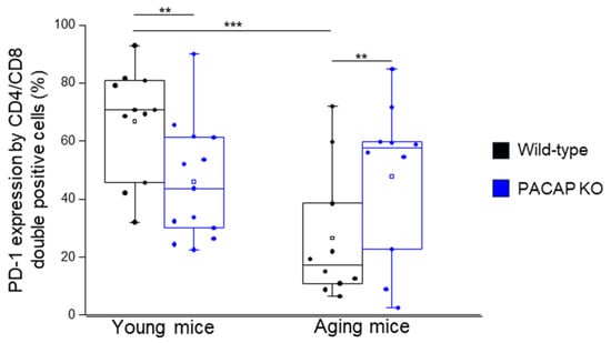 | PD-1 expression by CD3+ T-cells | 32.18 ± 11.64 | 31.48 ± 13.58 | 30.27 ± 9.80 | 19.88 ± 7.75 | aging WT vs. aging KO p = 0.043 young KO vs. aging KO p = 0.018 |