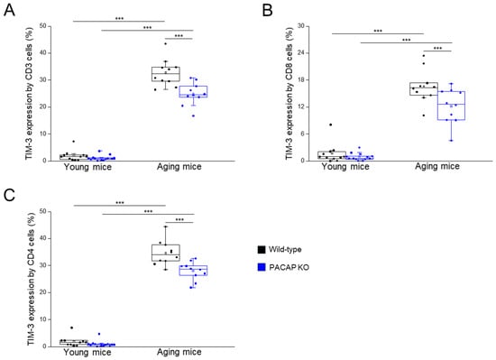 | TIM-3 expression by CD4+/CD8+ T-cells | 7.07 ± 6.96 | 2.36 ± 1.48 | 30.94 ± 8.33 | 22.01 ± 4.32 | aging WT vs. aging KO p = 0.001 young WT vs. aging WT p < 0.001 young KO vs. aging KO p < 0.001 |