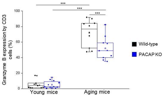 | Granzyme B expression by CD8+ T-cells | 8.58 ± 7.72 | 7.61 ± 5.02 | 74.39 ± 14.67 | 71.13 ± 15.99 | young WT vs. aging WT p < 0.001 young KO vs. aging KO p < 0.001 |