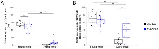 | CD69 expression by CD4+ T-cells | 30.61 ± 5.31 | 27.92 ± 11.09 | 6.00 ± 1.49 | 4.11 ± 2.77 | young WT vs. aging WT p < 0.001 young KO vs. aging KO p < 0.001 |
