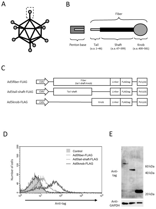 The construction of vector plasmids pCMV-Ad5fiber-FLAG, pCMV-Ad5tail-shaft-FLAG, and pCMV-Ad5knob-FLAG was carried out as follows. Initially, a polymerase chain reaction (PCR) fragment, which contained a sequence surrounding the Ad type 5 fiber, tail-shaft, or knob gene, was generated using primers (fiber-forward: 5-GAATTCAAAATGGGGGTACTCTCTTTGCGCCTATC-3, fiber-reverse: 5-TCTAGATTATTTGTCATCATCGTCCTTGTAGTCAGAGCCACTCCCTGAACCGGATCCTAGCTTATCATTATTTTTGTTTCCTACTGT-3, tail-shaft-forward: 5-GAATTCAAAATGGGGGTACTCTCTTTGCGCCTATC-3, tail-shaft-reverse: 5-TCTAGATTATTTGTCATCATCGTCCTTGTAGTCAGAGCCACTCCCTGAACCGGATCCTAGCTTATCATTATTTTTGTTTCCTACTGT-3, knob-forward: 5-GAATTCAAAATGACTTTGTGGACCACACC-3, fiber-reverse: same primer as above) and pAdHM4 as a template [45]. This PCR fragment was subsequently ligated with EcoRI/XbaI-digested pCMVSL3 [46], resulting in the formation of pCMV-Ad5fiber-FLAG, pCMV-Ad5tail-shaft-FLAG, and pCMV-Ad5knob-FLAG.