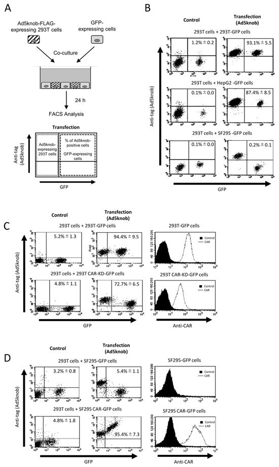 CAR-specific cell-to-cell spread of knob protein (A) Schematic representation of experimental methods. (B–D) Flow-cytometry analysis of type 5 Ad knob protein (Ad5knob) on various co-cultured GFP-expressing cells. Twenty-four hours post-transfection of 293T cells, cells were harvested using 2 mM EDTA/PBS and co-cultured with either CAR-positive or CAR-negative cells (B), CAR-knockdown 293T cells (C), or CAR-expressed SF293 cells (D). After 24 h of co-culture, cells were harvested using 2 mM EDTA/PBS and analyzed by flow-cytometry using an anti-DDDDK monoclonal antibody as outlined in Section 4. Data are expressed as mean ± S.D. (n = 3).