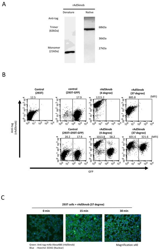 One microgram of rAd5knob protein, in a sample buffer containing 4% 2-Me, was loaded onto an SDS—polyacrylamide gel after boiling for 5 min. This was followed by electrotransfer to a nitrocellulose membrane. Conversely, one microgram of rAd5knob protein in a native buffer was loaded onto a non-SDS—polyacrylamide gel, which was also followed by electrotransfer to a nitrocellulose membrane. After blocking in Block Ace, the filters were incubated with the anti-DDDDK mouse antibody (1:1000). This was followed by incubation with a peroxidase-labeled anti-mouse antibody (1:10,000). The filters were then developed by chemiluminescence, and signals were read using an LAS-3000 imaging system.