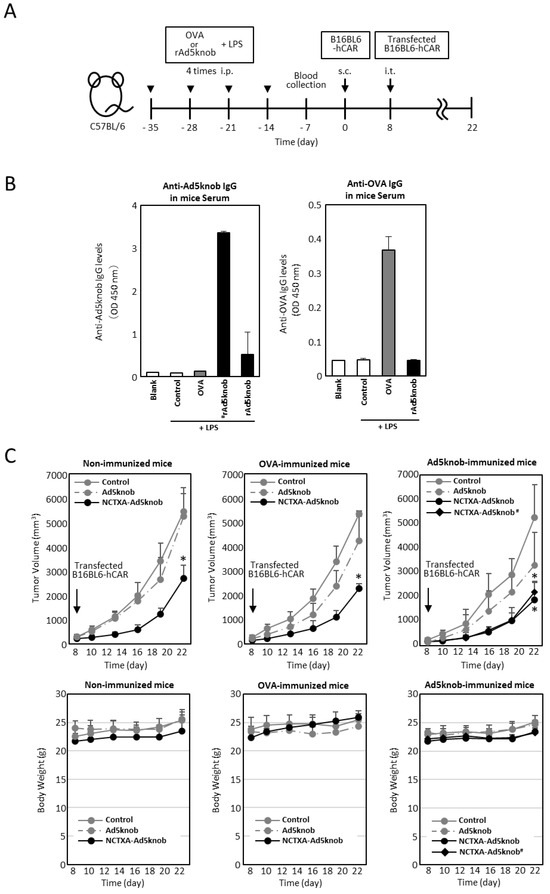 The existence of anti-Ad5knob antibodies in vivo could potentially diminish the therapeutic effect and induce side effects, given that Ad5knob proteins are found on the surface of transfected cells and are also detected on the surface of nearby cells. We examined whether the carrier function of the Ad5knob protein was impeded in the presence of anti-Ad5knob antibodies using Ad5knob-immunized mice. To create Ad5knob-immunized mice, the recombinant His-Ad5knob protein and lipopolysaccharide were intraperitoneally administered to mice four times at weekly intervals, with blood collection occurring one week after the final intraperitoneal administration. After quantifying the antibody levels in the blood, C57BL6 mice were implanted with B16BL6-hCAR via subcutaneous administration. After 8 days, B16BL6-hCAR cells expressing NCTXA-Ad5knob were transplanted into mouse tumor tissue expressing human CAR (Figure 6A). The quantity of anti-Ad5knob antibody in blood samples was detected by an ELISA assay using recombinant Ad5knob-FLAG protein as the antigen. The Ad5knob-immunized mice were divided into two groups, one with high anti-Ad5knob antibody levels (#rAd5knob) and the other with low anti-Ad5knob antibody levels (rAd5knob), and the OVA-immunized mice were immunized with OVA in the same manner. As a result of the ELISA assay, we successfully generated tumor-bearing mice with antibodies specific to Ad5knob and OVA (Figure 6B). To investigate the impact of anti-Ad5knob antibodies on Ad5knob, we confirmed the anti-tumor effect of NCTXA-Ad5knob using Ad5knob-immunized tumor-bearing mice, as the anti-tumor effect of NCTXA-Ad5knob was enhanced by the carrier function of the Ad5knob protein. Consequently, in all immunized mice, the transplantation of B16BL6-hCAR cells expressing NCTXA-Ad5knob significantly inhibited the increase in tumor size, and the inhibitory effect was nearly identical (Figure 6C). Additionally, the anti-tumor effects of NCTXA-Ad5knob were independent of anti-Ad5knob antibody levels. There was no significant loss of body weight in any group (Figure 6C). The findings suggest that the use of Ad5knob proteins as carriers for cancer gene therapy does not lead to significant adverse side effects. Moreover, the presence of anti-Ad5knob antibodies does not influence the functional enhancement of the fusion protein of Ad5knob with a functional protein.