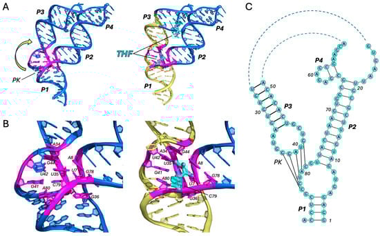 - Huang, L.L.; Ishibe-Murakami, S.; Patel, D.J.; Serganov, A. Long-range pseudoknot interactions dictate the regulatory response in the tetrahydrofolate riboswitch. Proc. Natl. Acad. Sci. USA 2011, 108, 14801–14806. [Google Scholar] [CrossRef]