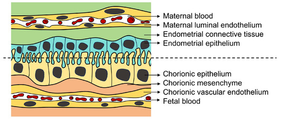 The porcine placenta is classified as a diffuse, epithelial chorionic, and indeciduate placenta [8]. In this type of placenta, chorionic villi are distributed across the surface of the chorionic membrane, with blood vessels situated within the chorionic villi. Notably, there are minor variations in the abundance of chorionic villi among different placental regions [6]. The epithelial chorionic villus placenta is characterized by fetal chorionic trophoblast cells that are in direct contact with the epithelial cells of the maternal endometrium. Importantly, both the chorionic villus and the endometrium remain intact in the placenta, maintaining their independence [9,10]. The term ‘indeciduate placenta’ signifies that the embryo’s allantoic–chorionic membrane does not invade the maternal endometrium, resulting in a fetus that can be delivered without causing a uterine wall hemorrhage [7]. The interhaemal barrier of the porcine placenta comprises the cellular layers separating the fetal and maternal blood circulations. On the maternal side, this barrier consists of the maternal luminal endothelium, endometrial connective tissue, and endometrial epithelium. On the fetal side, it includes the chorionic epithelium (trophoblast), chorionic mesenchyme, and chorionic vascular endothelium [11,12] (Figure 1).
