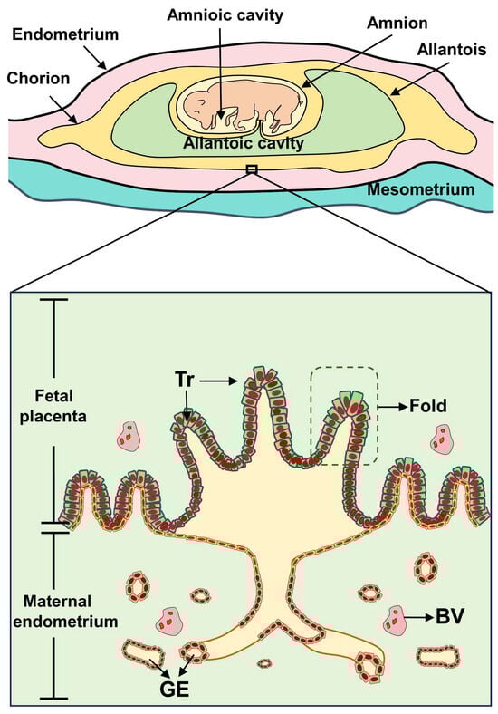 Diagram of the morphologic structure of the pig placenta. Tr: trophoblast; GE: Glandular epithelial cells; BV: blood vessel.
