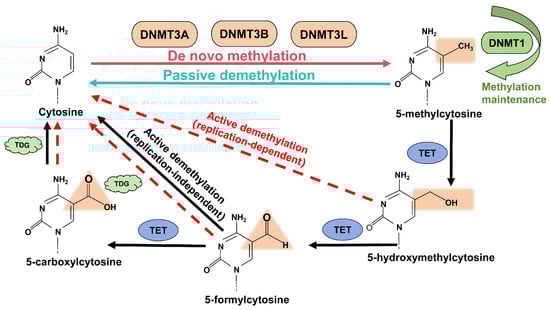 DNA methylation modification involves the addition of methyl groups (-CH3) to the cytosine bases of DNA, primarily occurring at the CpG site [27,28]. DNA methylation changes can be categorized into three phases: writing, maintenance, and erasure (Figure 3). Methyl-transferases, such as DNA (cytosine-5) methyltransferase 3 alpha (DNMT3A), DNA (cytosine-5) methyltransferase 3 beta (DNMT3B), and DNA (cytosine-5) methyltransferase 3-like (DNMT3L), are primarily responsible for the writing of DNA methylation, with DNMT3A and DNMT3B directly catalyzing the methylation of unmethylated DNA strands [29]. DNMT3L, although lacking catalytic activity, can bind to DNMT3A and DNMT3B to enhance their functions [30,31]. The maintenance of DNA methylation is primarily mediated by the methyl-maintaining enzyme DNMT1, which preferentially targets hemimethylated DNA for conversion to methylated DNA [32]. The Ten-eleven translocation (TET) family is primarily responsible for DNA methylation erasure. Three members of the TET protein family (TET1, TET2, TET3) can convert 5-methylcytosine (5mC) to 5-hydroxymethylcytosine (5hmC), a crucial modification for genomic reprogramming in mammalian primordial germ cells and early embryonic development [33,34,35]. During base excision repair, Thymine DNA Glycosylase (TDG), a member of the uracil DNA glycosylase family, can perform G/T mismatch repair, which can repair 5mC:G to unmodified C:G [36].