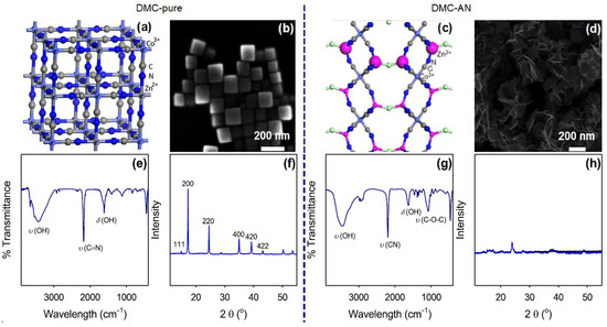 Characterization and comparison of “pure” Zn/Co DMC and Zn/Co DMC-MeCN: (a,c) DFT-optimized DMC structure. (b,d) SEM images. (e,g) FT-IR spectra. (f,h) XRD patterns. Reprinted with permission from [64]. Copyright (2023) Elsevier B. V., Amsterdam, The Netherlands.