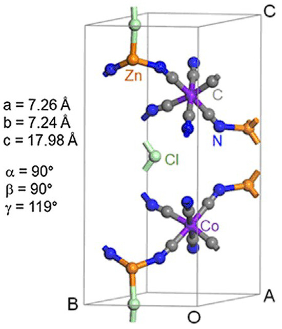 Idealized unit cell of the ZnCl2-based Zn/Co DMCC. Reprinted with permission from [52]. Copyright (2019) Elsevier B. V., Amsterdam, The Netherlands.