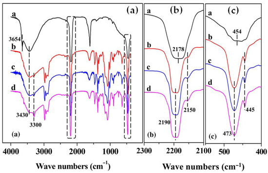 FT-IR spectral analysis gives some insight into the nature of chemical bonds in Zn/Co DMCCs [31]. The FT-IR spectra exhibit characteristic absorption peaks of –CN, Co–CN and –OH fragments. Stretching vibration of CN− in Zn3[Co(CN)6]2·nH2O appeared at 2178 cm−1, which is shifted to higher wavenumber in comparison with ν(CN) of K3[Co(CN)6] (2128 cm−1). It proves that CN− acts not only as a σ-donor to Co3+ but also as an electron donor in the CN–Zn2+ fragment [37]. The shift of ν(Co–CN) band from 416 cm−1 for K3[Co(CN)6] to 454 cm−1 for Zn3[Co(CN)6]2·nH2O also proves the formation of a Co3+–CN–Zn2+ structure (Figure 3). In the CN− adsorption region (Figure 3b), additional absorption overlapping peaks (~2190 and 2152 cm−1) were detected in the spectra of the Zn/Co DMCCs; these peaks were attributed to amorphous phase and monoclinic structure, respectively. The absorption peaks of Co–CN at 445 and 473 cm−1 were assigned to amorphous phase and monoclinic structure, respectively (Figure 3c) [31].