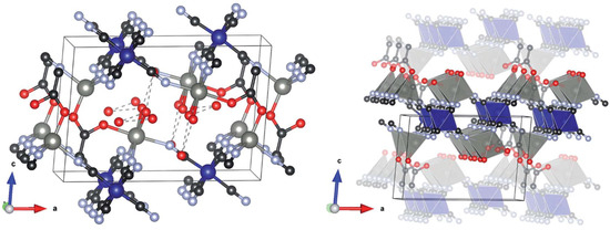 Crystal structure of Zn2[Co(CN)6](OAc)∙4H2O (left) and polyhedral view showing the stacking of the layers in Zn2[Co(CN)6](OAc)∙4H2O (right). Red, blue, light grey, dark grey, and black spheres represent O, N, C, Zn, and Co atoms, respectively. H atoms were omitted for clarity. Reprinted with permission from [60]. Copyright (2019) Royal Society of Chemistry, London, UK.