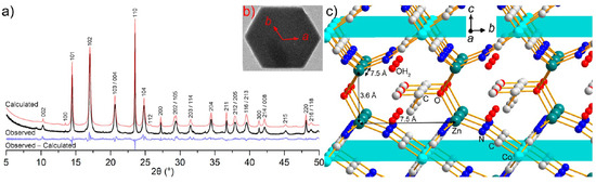 (a) Rietveld refinement of synchrotron XRD data, (b) TEM image of a hexagon plate, and (c) elucidated structure of [(MeOCMe2O)Zn+][Zn2+][(Co(CN)63−]. In (c), only the MeOCMe2O-fragment is depicted among the three disordered positions, with hydrogen atoms omitted for clarity. Reprinted with permission from [62]. Copyright (2024) American Chemical Society, Washington, D.C., USA.