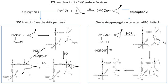 The possibility of alternative reaction mechanisms (Figure 10) meeting the kinetics of DMC-catalyzed polymerization of PO was studied and discussed in [104]. Direct experimental evidence in favor of binuclear mechanism (coordination of PO molecule and its reaction with an external polymer chain end) were based on kinetic measurements; therefore, the catalytic action of Zn/Co DMCCs can be more readily understood by considering them as an individual “microreactors”, which brings to the fore the factors of the PO diffusion rate and poly(PO) segment length.