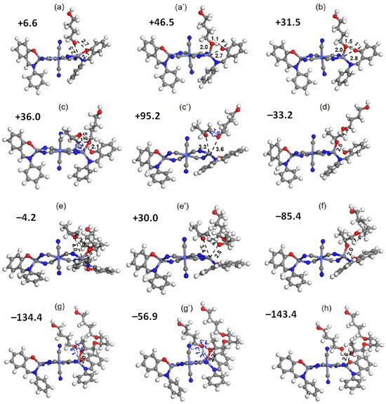 DFT modeling of the ROP of PO, catalyzed by Zn/Co DMCCs, was also carried out recently by Verma et al. on a molecular level (PW91 functional, double numerical plus polarization basis set) as a part of the study of complexes, prepared with the use of Schiff bases as CAs [114]. The structures of the key intermediates and transition states for HO(CH2)4OH-initiated ROP of PO, catalyzed by the complex of (E)-2-((phenylimino)methyl)phenol, are presented in Figure 11. The authors proposed a single-site reaction coordination–insertion mechanism for this process; the overall calculated activation barrier for the polymerization of PO was +95.2 kJ∙mol−1 and the overall reaction was exergonic by −78.2 kJ∙mol−1.