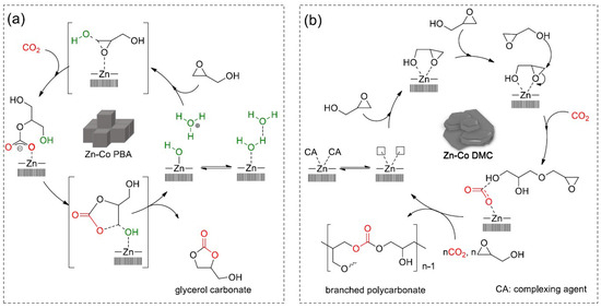 The increased interest in these catalysts arises from ability of DMC complexes to initiate ring-opening polymerization (ROP) of oxiranes (Scheme 1a), mainly propylene oxide (PO), with a formation of polyethers that have multitude of applications ranging from soft components in polyurethane foaming to pharmaceutical formulations [6,7]. The ability of DMC catalysts (DMCCs) to introduce CO2 to growing polymer chains with the formation of poly(ether-carbonate)s (PECs) (Scheme 1b) [8,9] maintains interest in these catalytic systems, forcing scientists to continue studies in this field. In recent reviews, the matters of the synthesis, structure, and reaction mechanisms of DMCCs [5,10,11,12,13] and their applications in polymer chemistry [4,5,6,7,8,9,14,15] were discussed. However, the topic of DMC complexes is not exhausted by these aspects, and in the present work we tried to describe and discuss all facets of the preparation, catalytic action, and use of DMCCs, focusing on specific applications, new processes, and materials, based on recent publications in this field.