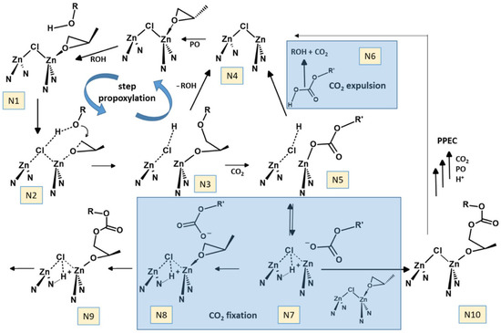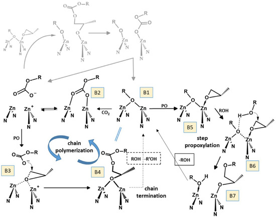 In the frameworks of conventional concepts of the nature of catalytic species, single electrophilic Zn ions in different ligand environment represent catalytic sites. However, in many works, devoted to the coordination–insertion mechanism of ring-opening polymerization, the role of bimetallic catalyst species was proposed and proven [109,110,111,112,113]. Based on DFT modeling results for Zn2[Co(CN)6]Cl [52], the distance between Zn atoms (4.4 Å) meets the possibility of bimetallic coordination–insertion mechanism for Zn/Co DMCCs. This concept was further developed in theoretical studies of PO/CO2 copolymerization (see below).
