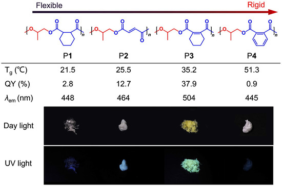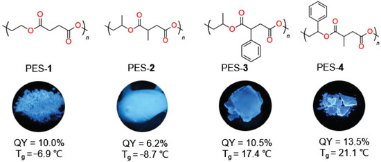- Chu, B.; Zhang, H.; Hu, L.; Liu, B.; Zhang, C.; Zhang, X.; Tang, B.Z. Altering Chain Flexibility of Aliphatic Polyesters for Yellow-Green Clusteroluminescence in 38 % Quantum Yield. Angew. Chem. Int. Ed. 2022, 61, e202114117. [Google Scholar] [CrossRef]