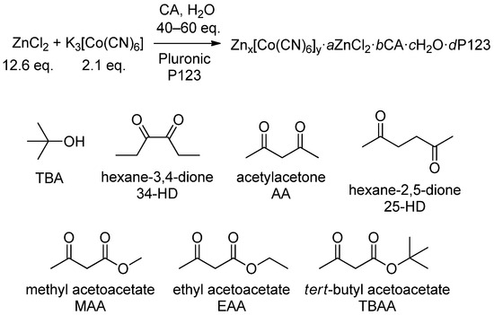 Besides tBuOH, many other organic compounds (alcohols, aldehydes, ketones, ethers, esters, carboxylic acids, amides, ureas, nitriles) were tested as CAs [7,10,55]. In an early study [18], the use of Ca3[Co(CN)6]2 was proposed in combination with 1,2-dimethoxyethane; the yield of Zn/Co DMC complex was specified in this work, amounting to 1.05 g of the catalyst per 1 g of the starting Ca3[Co(CN)6]2.