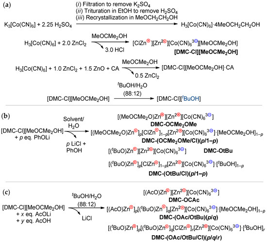(a) Preparation of Zn/Co DMC-Cl catalysts using H3[Co(CN)6]; (b) synthesis of Zn/Co DMCCs containing (RO)Zn+ Units and two components of (RO)Zn+ and ClZn+ units using different complexing agents; (c) preparation of Zn/Co DMCCs containing (AcO)Zn+ units, two components of (AcO)Zn+ and (tBuO)Zn+ units, and three components of (AcO)Zn+, (tBuO)Zn+, and ClZn+ units [62].