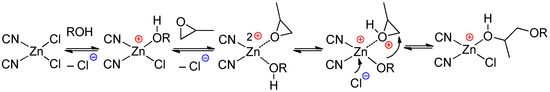 As was showed experimentally in the earlier works [38,98], Zn3[Co(CN)6]2 has low activity, as well as DMC complexes prepared without excess of ZnCl2 even in the presence of CAs, whereas excess of ZnCl2 endows DMCCs with high activity even in the absence of CAs. The mechanism of initiation of PO polymerization, proposed in [38,98], is presented in Scheme 5. In [107], a very similar mechanism with a replacement of both Cl− ligands by ROH was presented; this mechanism was mentioned in review of Herzberger et al. [7], despite the low probability of double substitution of Cl− ligands by ROH (quite apart from the fact that the presence of ZnCl2 fragment in DMCC is doubtful, see Figure 1 and Figure 2).