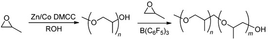 - Huang, Y.J.; Qi, G.R.; Wang, Y.-H. Controlled ring-opening polymerization of propylene oxide catalyzed by double metal-cyanide complex. J. Polym. Sci. A Polym. Chem. 2002, 40, 1142–1150. [Google Scholar] [CrossRef]