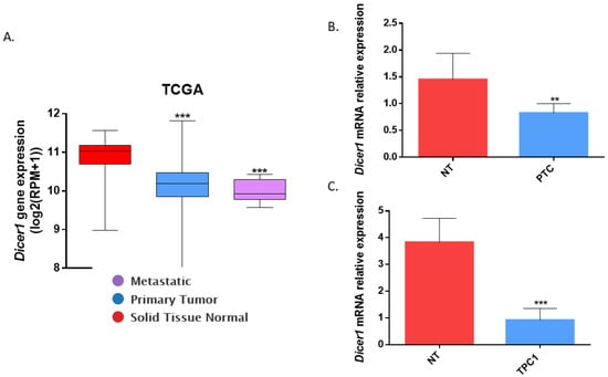 Dicer1 mRNA expression was decreased in the human PTC and in the PTC-derived cell line TPC1. (A) Analysis of Dicer1 mRNA expression in The Cancer Genome Atlas (TCGA) in normal samples (red, Solid Tissue Normal, n = 59), PTC (blue, primary tumors, n = 505), and metastases (purple, n = 8). The expression (log2 (RPM+1)) refers to the logarithm base 2 of the Reads Per Million (RPM) value increased by one. Statistically significant differences were determined using the Kruskal–Wallis test *** p < 0.001. (B) Analysis of Dicer1 mRNA expression using RT-qPCR in 9 PTC (blue) and their adjacent normal tissue (red, NT). Statistically significant differences were determined using the Mann–Whitney test ** p < 0.01. (C) Analysis of Dicer1 mRNA expression in the PTC-derived cell line TPC1 (blue, n = 7) compared with a pool of normal human thyroid tissues (red, NT, n = 8). The columns represent the mean values and the error bars indicate the standard deviation (mean ± SD). Statistically significant differences were determined using the Mann–Whitney test *** p < 0.001.