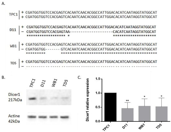 In line with this, downregulating or inactivating mutations of Dicer1, a type III ribonuclease involved in miRNA biogenesis has been described in thyroid and other cancers [,,,,]. Dicer1 syndrome is an autosomal dominant tumor predisposition syndrome caused by germline mutations in Dicer1 []. Dicer1 mutations, though rare, have been found in certain thyroid cancers, including the more aggressive variants [,]. Furthermore, Dicer1 mRNA is downregulated in malignant thyroid samples and cell lines compared with normal tissues, and this downregulation is associated with aggressive features []. We confirmed this downregulation in nine PTCs and their adjacent tissues and showed that the thyroid cancer-derived cell lines TPC1 and BCPAP present very low levels of Dicer1. However, despite the fact that reduced levels of Dicer1 mRNA have been reported in tumors, a loss of heterozygosity in Dicer1 is rare [].