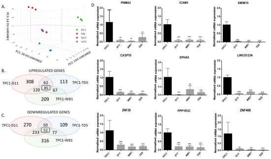 RNAseq analysis did not reveal major transcriptomic changes in heterozygous cell lines. (A) PCA analysis of gene variance between TPC1 (purple), D11 (green), WB1 (blue), and TD5 (red). (B,C) Analysis of common upregulated or downregulated genes between TPC1 and D11 (red), TPC1 and WB1 (green), and TPC1 and TD5 (blue). (D) PNMA2, ICAM1, SMIM10, CASP10, EPHA5, LINC01234, ZNF28, PPP1R3C, and ZNF468 mRNA expression analysis using RT-qPCR in TPC1, D11, WB1, and TD5 cell lines (n = 5). The columns represent the mean values and the error bars indicate the standard deviation (mean ± SD). Statistically significant differences were determined using the Kruskal–Wallis test. ** p < 0.01 and *** p < 0.001.