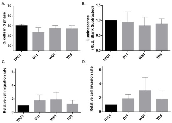 Then, to investigate the impact of Dicer1 heterozygous deletion on cell behavior, we performed proliferation (Figure 4A), apoptosis (Figure 4B), and migration or invasion (Figure 4C,D) analyses. No differences were observed between the parental TPC1 cell line and the heterozygous Dicer1 (+/−) cell lines D11, WB1, and TD5, supporting the previous results obtained by the RNAseq, where no major pathways were observed deregulated.