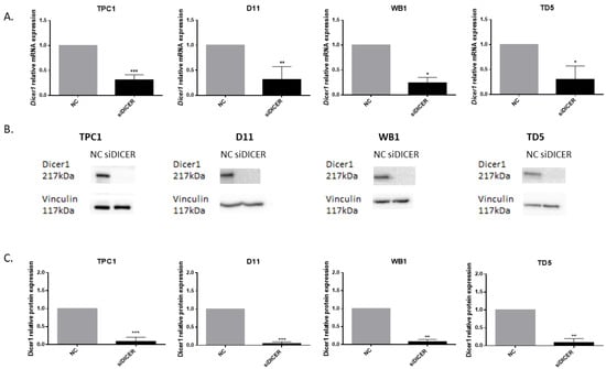 Dicer1 mRNA and protein expression were strongly reduced four days after Dicer1 siRNA transfection. (A) Dicer1 mRNA expression was analyzed using RT-qPCR in the TPC1 (n = 7), D11 (n = 5), WB1 (n = 4), and TD5 (n = 4) cell lines transfected with the negative control (NC) or with Dicer1 siRNA (siDICER). (B) Western blot analysis of Dicer1 protein expression in the same conditions. The upper image corresponds to the detection of Dicer1 with a molecular weight of 217 kDa, while the lower panel corresponds to the detection of vinculin with a molecular weight of 117 kDa. (C) Quantification of Dicer1 protein levels in TPC1 (n = 8), D11 (n = 7), WB1 (n = 6) and TD5 (n = 6) cells. Data were normalized to NC. The columns represent the mean values and the error bars indicate the standard deviation (mean ± SD). Statistically significant differences were determined using the Mann–Whitney test. * p < 0.05, ** p < 0.01 and *** p < 0.001.