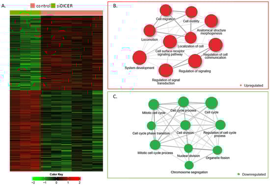RNAseq analysis revealed transcriptomic alterations after transfection with Dicer1 siRNA in D11 cells. (A) Heatmap representation of the hierarchical clustering (Pearson < 0.0001) of genes selected with DESeq2 method, FDR 0.05, and fold change 1.5× (following Dicer1 siRNA (siDICER)) transfection vs. control (following transfection with negative control (NC)) (1123 upregulated genes, in red, and 1204 downregulated genes, in green). (B,C) Top 10 upregulated or downregulated pathways network obtained through the enrichment analysis of gene expression (FDR 0.05 and minimum fold change 1.5×) in D11 cells transfected with siDICER compared with controls using The Gene Ontology Biological Process database.