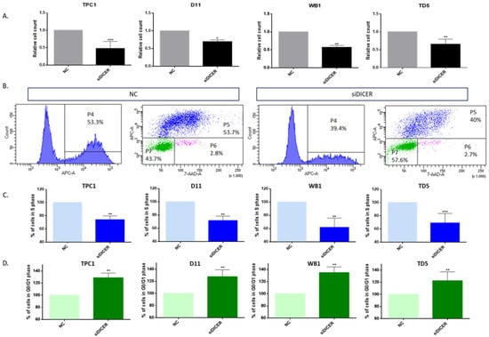 Total Dicer1 loss inhibited proliferation. (A) Cell counts were conducted in TPC1 (n = 7), D11 (n = 4), WB1 (n = 5), and TD5 (n = 5) cell lines transfected with the negative control (NC) or with Dicer1 siRNA (siDICER). (B) TPC1 cells transfected with the negative control (NC) or with Dicer1 siRNA (siDICER) were intracellularly stained with Anti-BrdU-APC-A and 7-AAD using the BrdU Staining Kit for Flow Cytometry. For each condition (NC or siDICER), the left panel shows only BrdU positive cells (S phase, P4). On the right panel, BrdU positive cells are stained in blue (S phase, P5) and BrdU negative cells are stained in green (low 7-AAD concentrations, G0/G1 phases, P7) or purple (high 7-AAD concentrations, G2/M phases, P6). (C) Quantification of cells in P5 (S phase) in TPC1 (n = 7), D11 (n = 4), WB1 (n = 5), and TD5 (n = 5) cell lines following negative control (NC) or Dicer1 siRNA (siDICER) transfection. (D) Quantification of cells in P7 (G0/G1 phases) in the same experimental conditions. All experiments were conducted four days after transfection. Data were normalized to the NC. The columns represent the mean values and the error bars indicate the standard deviation (mean ± SD). Statistically significant differences were determined using the Mann–Whitney t-test. * p < 0.05, ** p < 0.01 and *** p < 0.001.