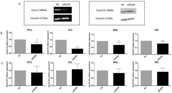 Cyclin E but not cyclin D1 was downregulated following Dicer1 siRNA transfection. (A) Western blot analysis of cyclin E and cyclin D1 protein expression in TPC1 cells transfected with the negative control (NC) or with Dicer1 siRNA (siDICER). The upper image corresponds to the detection of cyclin E or D1 (48 kDa and 34 kDa, respectively) while the lower panel corresponds to the detection of vinculin (117 kDa). (B) Western blot quantification of cyclin E expression in TPC1 (n = 6), D11 (n = 4), WB1 (n = 6), and TD5 (n = 7) cell lines following negative control (NC) or Dicer1 siRNA (siDICER) transfection. (C) Western blot quantification of cyclin D1 expression in the same experimental conditions (n = 6). Cyclin expression was normalized to vinculin expression and data were normalized to the NC. The columns represent the mean values and the error bars indicate the standard deviation (mean ± SD). Statistically significant differences were determined using the Mann–Whitney t-test. * p < 0.05, ** p < 0.01 and *** p < 0.001.