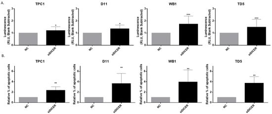 Total loss of Dicer1 resulted in an increase in apoptosis. (A) Apoptosis was analyzed using Caspase-Glo® 3/7 Assay in TPC1 (n = 10), D11 (n = 7), WB1 (n = 12), and TD5 (n = 12) cells transfected with the negative control (NC) or with Dicer1 siRNA (siDICER). (B) The percentage of apoptotic cells was determined using a Dead cell apoptosis kit with Annexin V FITC and Propidium Iodide for flow cytometry in TPC1 (n = 5), D11 (n = 6), WB1 (n = 6), and TD5 (n = 6) cells transfected with the negative control (NC) or with Dicer1 siRNA (siDICER). Data were normalized to NC. The columns represent the mean values and the error bars indicate the standard deviation (mean ± SD). Statistically significant differences were determined using THE Mann–Whitney t-test. * p < 0.05, ** p < 0.01 and *** p < 0.001.