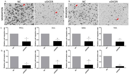 Dicer1 total loss inhibited migration and invasion. The number of cells migrating (A) or invading (B) was counted 4 days after transfection with the negative control (NC) or Dicer1 siRNA (siDICER). The red arrows point to examples of the cells. (C) Quantification of migrating cells in TPC1 (n = 4), D11 (n = 5), WB1 (n = 5), and TD5 (n = 4) cell lines. (D) Quantification of invasive cells in TPC1 (n = 4), D11 (n = 5), WB1 (n = 5), and TD5 (n = 4) cell lines. Data were normalized to NC. The columns represent the mean values and the error bars indicate the standard deviation (mean ± SD). Statistically significant differences were determined using the Mann–Whitney t-test. * p < 0.05 and ** p < 0.01.