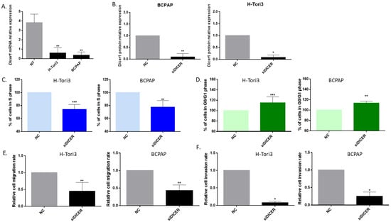 Both showed a significant decrease in Dicer1 mRNA expression compared with a pool of normal human thyroid tissues (Figure 11A). First, we analyzed transfection efficiency in BCPAP and H-Tori3 cell lines through flow cytometry using a fluorescent mimic SIGLO (5 mM), and transfection efficiency was confirmed to be greater than 98% in both cell lines (Supplementary Figure S6A,B). Then, we confirmed that Dicer1 protein expression was significantly diminished following Dicer1 siRNA transfection, reaching values close to zero (Figure 11B). As previously observed in TPC1 and TPC1-derived Dicer1 (+/−) cell lines (Figure 7, Figure 9 and Figure 10), our findings demonstrated a notable alteration of cell cycle progress, namely a reduction in the percentage of cells in S phase (Figure 11C) and increase in the number of cells in the G0/G1 phase (Figure 11D), though we did not observe significant changes in the amount of cells in the G2/M phase (Supplementary Figure S6C,D).