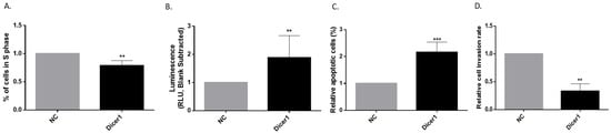 Increasing Dicer1 expression inhibited proliferation and invasion while raising apoptosis. All experiments were performed in TPC1 cells transfected with Dicer1 plasmid (Dicer1) 48 h after transfection. (A) Quantification of cells in S phase (n = 6). (B) Apoptosis was analyzed using Caspase-Glo® 3/7 Assay (n = 9). (C) The percentage of apoptotic cells was determined using a Dead cell apoptosis kit with Annexin V FITC and Propidium Iodide for flow cytometry (n = 9). (D) Quantification of invasive cells (n = 6). Data were normalized to NC (negative control: cells incubated in the presence of lipofectamine 3000). The columns represent the mean values and the error bars indicate the standard deviation (mean ± SD). Statistically significant differences were determined using the Mann–Whitney t-test. ** p < 0.01, *** p < 0.001.