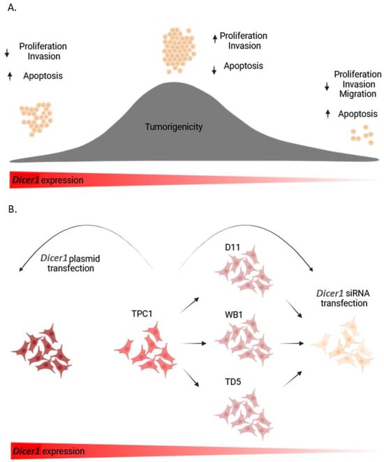Dicer1 exerted dosage-dependent effects in thyroid cells. (A) Very low levels or total absence of Dicer1 resulted in reduced (↓) proliferation, invasion and migration, along with increased (↑) apoptosis, suggesting an inhibition of tumorigenesis. Similarly, high levels of Dicer1 led to comparable proliferation, invasion, and apoptosis outcomes. Intermediate levels of Dicer1 (as in TPC1, D11, WB1, and TD5 cells) led to increased proliferation and reduced apoptosis, potentially promoting tumorigenesis. (B) High levels of Dicer1 were obtained via plasmid transfection. TPC1 had intermediate levels of Dicer1 and heterozygous Dicer1 (+/−) D11, WB1, and TD5 cells showed a 50% decrease in Dicer1 expression compared with TPC1 cells. Following Dicer1 siRNA transfection, Dicer1 was almost completely lost.