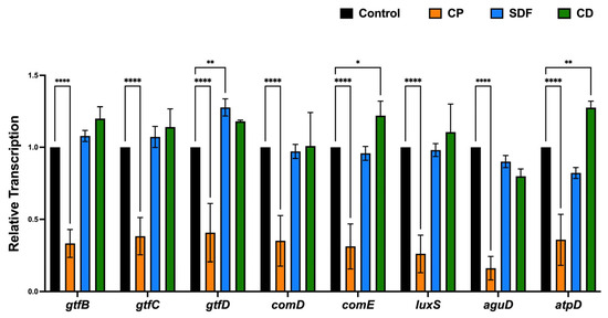 - Jeon, J.-G.; Klein, M.I.; Xiao, J.; Gregoire, S.; Rosalen, P.L.; Koo, H. Influences of naturally occurring agents in combination with fluoride on gene expression and structural organization of Streptococcus mutans in biofilms. BMC Microbiol. 2009, 9, 228. [Google Scholar] [CrossRef]