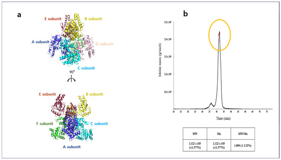 Multi-angle light scattering (MALS) was conducted to determine the absolute molecular weight of the A2HBD. The AKTA chromatography system was integrated with a MALS detector TREOS II MALS (WYATT). The purified protein concentration was diluted in the final buffer (20 mM Tris-HCl at pH 8.0 and 150 mM NaCl) to 2.018 mg/mL and analyzed using SEC-MALS. Protein solution was loaded on a Superdex 200 Increase analytical column (GE Healthcare), which is pre-equilibrated in a final buffer. The buffer′s flow rate was consistently upheld at 0.3 mL/min. Before experimenting, the bovine serum albumin (BSA) was quantified as a baseline reference measurement. ASTRA software (https://wyatt.com/products/software/astra.html, accessed on 30 September 2024, Wyatt Technology, Goleta, CA, USA), provided by MALS manufacturer, was utilized to process and analyze the data. The elution profile of A2HBD exhibited a predominant peak, which accounted for 92% of the scattered mass and was estimated to be approximately 212.2 kDa with a precision of ±1.577%. Considering its monomer molecular weight of 32.4 kDa, this mass value provides the estimate for a hexameric state when A2HBD is present in the solution (Figure 1b).