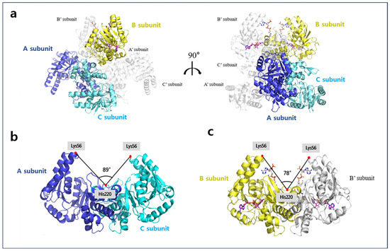 The overall structure of A2HBD in complex with NAD+ and acetoacetyl-CoA. (a) The merged hexamer of the A2HBD trimer and the symmetric subunit are shown as a cartoon. The trimeric asymmetric unit of the tertiary complex is shown as a colored cartoon. Subunits A and C are labeled as blue and cyan, respectively. The B subunit of the tertiary complex is shown in yellow. The bound ligand NAD+ and acetoacetyl-CoA are shown in magenta and white, respectively, in a stick model. The symmetric structure of A2HBD is shown in white. (b) Comparison of the cleft angle in subunit dimers. Non-bound subunits A and C dimer are shown as cartoons. Subunits A and C are colored blue and cyan, respectively. (c) The merged dimer of ligand-bound subunit B and its symmetric unit are shown as cartoons with yellow and white, respectively. The cleft angle is defined by Lys56 at the edge of α2 of the two subunits and His220 at the center of the dimer. The tilted cleft angle is further narrowed by the addition of ligands. Ligands of NAD+ and acetoacetyl-CoA are shown as stick models with magenta and white, respectively.