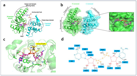The overall structure of A2HBD in complex with NAD+ and acetoacetyl-CoA. (a) Monomer structure of A2HBD complexed with NAD+ and acetoacetyl-CoA. The tertiary monomeric structure is depicted in a cartoon representation, with the N-terminal domain highlighted in green and the C-terminal domain in cyan. The presence of bound NAD+ and acetoacetyl-CoA is illustrated using a stick model, with NAD+ represented in magenta and acetoacetyl-CoA in white. The regions responsible for substrate binding, depicted as the clamp-roof and clamp-base domains, are indicated by a dotted circle in black and are appropriately labeled. (b) Crystal structure of A2HBD in complex with NAD+. (left) The “open-book” view of A2HBD monomer is shown in both the cartoon and surface diagram. Three sub-domains and two domains are labeled. The stick diagram of NAD+ is colored magenta. (right) An enlarged view of the cofactor-binding pocket. NAD+ is shown as a stick and A2HBD is shown as a surface. The subsites (S1, S2, S3) of A2HBD are labeled. (c) The detailed interaction between NAD+ and A2HBD. The G-x-G-x-x-G motif is marked as yellow. Hydrogen bonding interactions are indicated as black dashed lines. (d) Schematic interactions between NAD+ and A2HBD. Hydrogen bonding interactions are indicated as black dashed lines, whereas hydrophobic interactions are not indicated in lines.