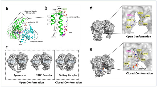 Domain shifting of A2HBD upon acetoacetyl-CoA binding. (a) Superimposition of NAD+ complex A2HBD (white) and tertiary complex (green and cyan). Clamp-roof domain movement (α2 to α2′) is described in (a) dotted box. NAD+ in cofactor complex, which is transparent, relocated to clear NAD+ (magenta) upon substrate binding. (b) The detailed cartoon diagram of clamp-roof domain shifting with (a) dihedral angle of 11 degrees upon substrate binding. (c) Surface diagram of open-to-closed conformation followed by substrate binding. (d,e) The open-close conformational change in residues of the catalytic cavity. Amino acid residues involved in forming catalytic cavities are shown as a stick model with a yellow color. “Catalytic cavity” is presented with a dotted circle. Upon substrate binding, the size of the cavity decreased by about 55%. The cation-π interaction (Asn139-Phe230) is shown as dotted red lines.