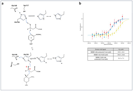 (a) Structure-based catalytic mechanism of the acetoacetyl-CoA-catalyzed reaction. Schematic diagram of proposed catalytic mechanism in A2HBD active site. Hydride transfer and nucleophilic substitution are presented as blue-colored arrows. Polarized carbonyl carbon and oxygen are indicated as red-colored δ+ and δ−,, respectively. (b) Binding affinity analysis of NAD+, acetoacetyl-CoA, and NAD+/acetoacetyl-CoA by MST experiments. The Kd values were showed BHBD with acetoacetyl-CoA in red color; BHBD in NAD+, and acetoacetyl-CoA in cyan color; BHBD with NAD+ in yellow color, respectively. Each Kd value is shown in the table.