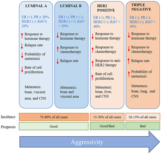 Molecular classification of breast cancer, listing the principal characteristics of each subtype [6]. ER, estrogen receptor; PR, progesterone receptor; HER2, human epidermal growth factor 2. The red down-pointing or up-pointing arrows indicate a decrease or increase, respectively. The blue arrow to the right indicates an increase in aggressiveness.